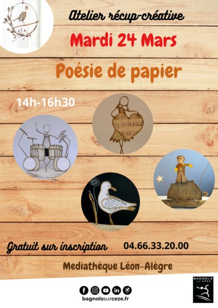 Atelier créatif : Poésie de papier. Imaginaire et poésie sont au rendez-vous avec des petites sculptures, réalisés avec du papier décoratif et du fil kraft armé. Gratuit pour adultes, sur inscription.
