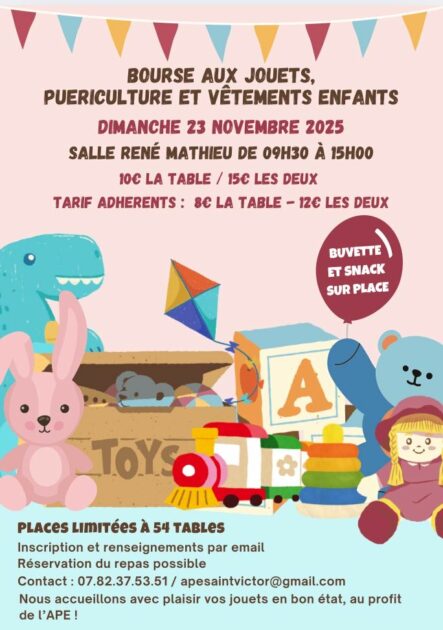 Bourse aux jouets, L’ape de Saint Victor la Coste organise sa 2ème bourse aux jouets le 23 novembre de 9h à 15h. Nombre de table limitée, pour réserver une table exposant veuillez nous contacter par mail.Possibilité de réserver un repas sur commande.