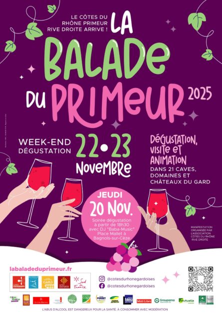 Le jeudi 20 novembre 2025 une soirée dégustation est prévu à partir de 18h30 avec DJ « Baba-Music » place Mallet à Bagnols-sur-céze et lancera les festivités du week-end ( 22-23 novembre 2025) dans 21 caves, domaines et châteaux du Gard rhodanien.